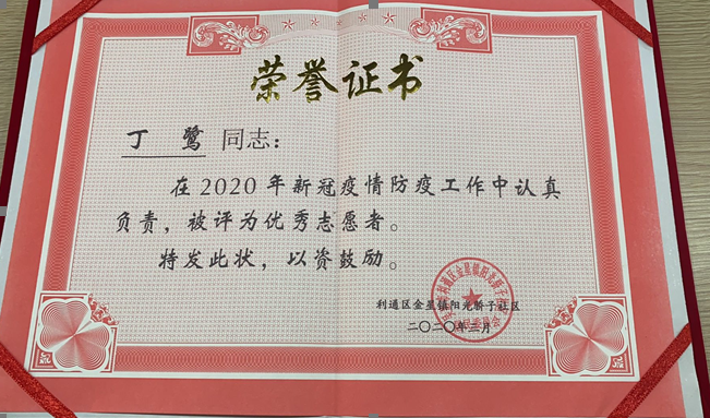 作为一名勇于奉献的新时代青年,丁鹭对青春有着自己的见解:“我觉得青春只有一次,不能虚度人生中最美好的时光,应该放飞青春、追逐梦想,在最灿烂的年纪做最有意义的事情,不给自己留下遗憾。”参与社区志愿,散发自己光和热,是她青春颜色中最亮丽的时刻。