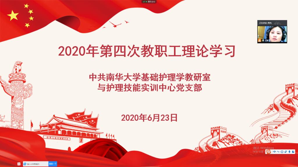 根据学校党委的统一部署,2020年6月23日下午,伟德国际victor1946基础护理学教研室与护理技能实训中心党支部通过腾讯会议开展2020年第四次教职工理论学习,党支部全体教职工参加了此次学习。会议由支部书记王蓉主持。