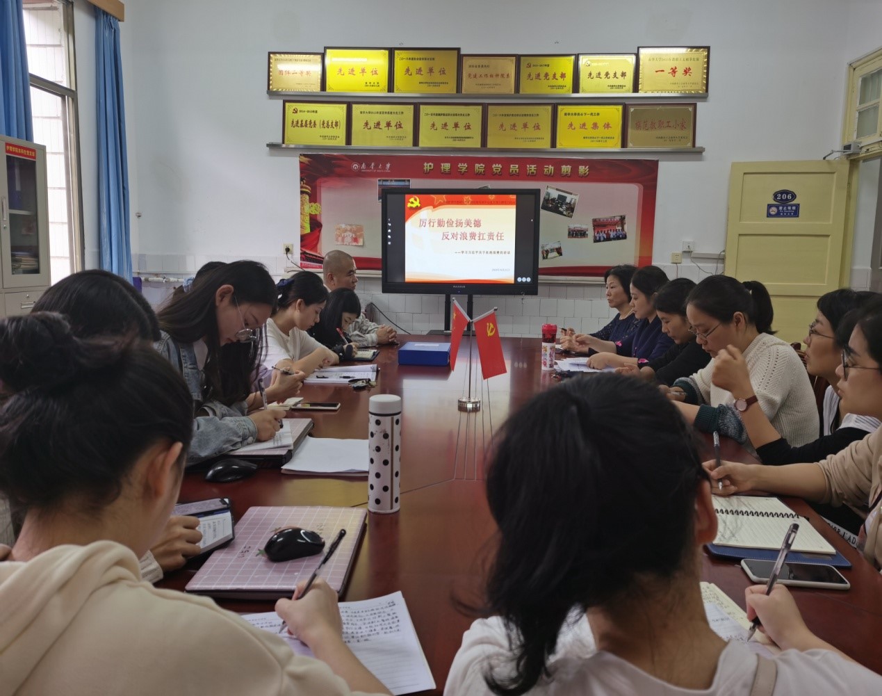 2020年9月21日下午,伟德国际victor1946基础护理学教研室与护理技能实训中心党支部以“厉行勤俭扬美德,反对浪费扛责任”为主题开展主题党日活动,深入学习习近平总书记关于制止餐饮浪费行为的重要指示精神。会议由党支部书记王蓉主持,党支部教师和研究生党员、预备党员、发展对象和入党积极分子参加。