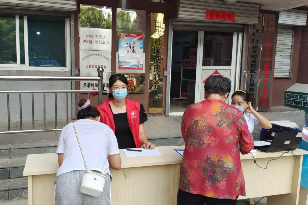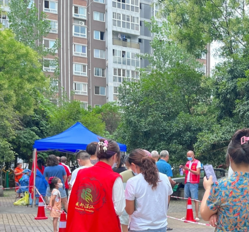 217班张萌、216班龚雪分别在7月22日和8月13日协助当地社区工作人员监督大家排队、劝导佩戴口罩、引导居民方向、帮助居民制作核酸二维码。8月7日,201班陈晓文认为“疫情当前,没有人是旁观者,每个人都是责任人。”她积极参与志愿者活动,为做核酸的人们做体温检测、引导其出示行程码。