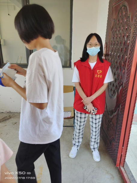 7月15日到17日,216班付嬿晶主动参加志愿者,协助村民出示健康码、扫码登记,耐心地引导长者、残疾人、孕妇等特殊群体到指定地点进行核酸检测。