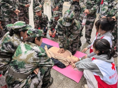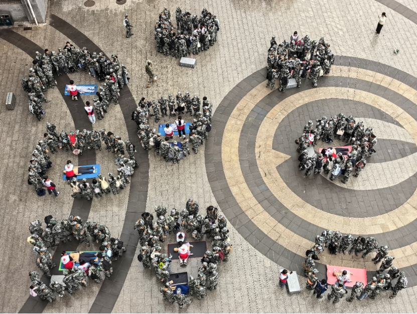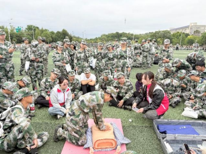 心肺复苏急救实操环节由伟德国际victor194640余名硕士研究生组成培训小分队,下到每一个军训连队,开展“一对一、手把手”指导。“手肘要伸直,借助上半身力量按压,看到模拟人胸廓起伏才算有效。”志愿者先示范标准动作,再逐一纠正新生操作细节,确保每人都能独立完成完整的心肺复苏流程。军训教官全程协同组织,保障培训高效有序推进。