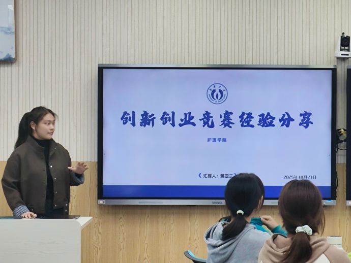“创新创业竞赛不是‘天马行空’,而是‘专业+需求’的精准对接。”分享会上,蒋亚兰同学以自身参赛经历为切入点,围绕双创竞赛的核心价值与实战策略展开深度讲解。她指出,护理专业学生参与双创竞赛,关键在于立足专业背景,从临床护理痛点、社区健康需求等社会议题中挖掘项目选题,既要保证创新视角,更要具备落地可行性。