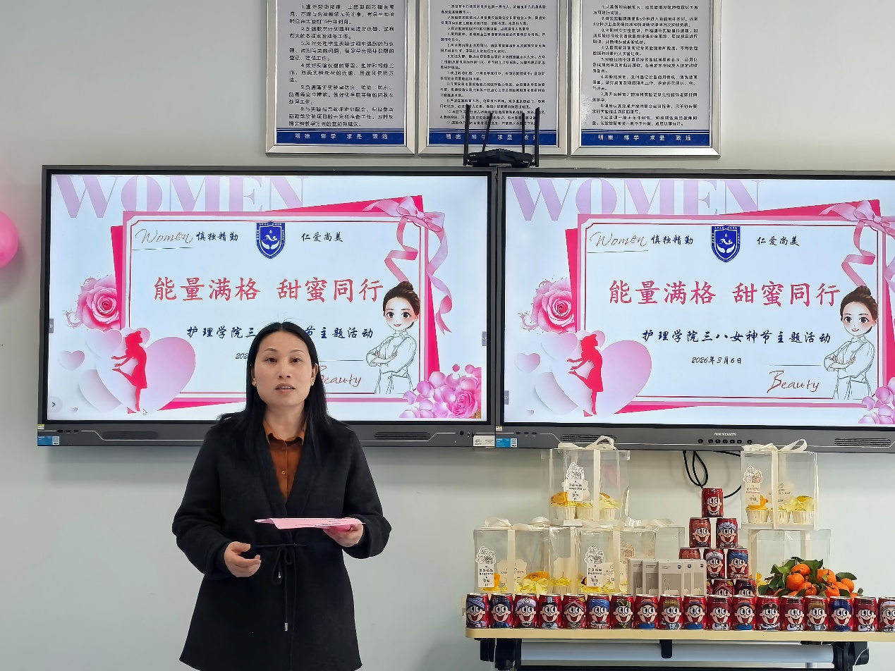 首先院长李忠玉致辞,向全体女教师致以节日问候与美好祝福。她表示,女教师们深耕教学、科研与管理一线,是学院发展的核心力量,既是教书育人的“提灯女神”,也是兼顾家庭的全能能手。李院长指出,本次活动以“甜蜜、能量、同行”为核心,希望大家暂时放下工作忙碌,放松身心、享受甜蜜,学院将始终做女教师们的坚强后盾与温暖港湾,鼓励大家保持能量满格,以健康与快乐为底气,在护理事业中绽放光彩。