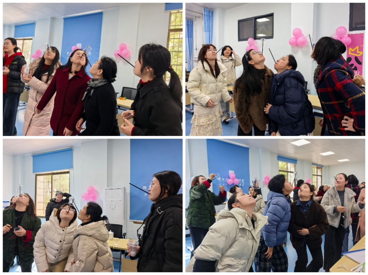 随后,学院领导为女教师颁发节日纪念品,传递学院的关怀与敬意。趣味互动环节中,全体人员分组参与“吸管传杯”游戏,大家默契配合、欢声笑语不断,有效增进了彼此交流,现场氛围温馨热烈。