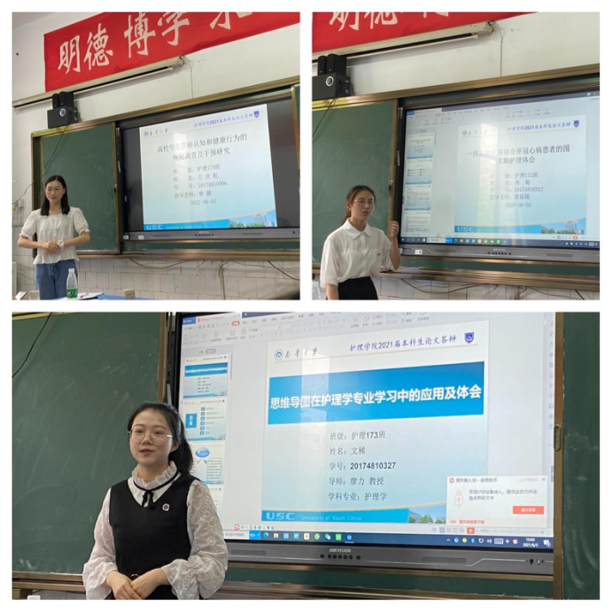 参加答辩的同学们通过PPT依次详细阐述选题背景、研究目的、研究内容、重要成果等要点。文稀、方庆虹、冉菊三位同学针对自己的论文做出了精彩的汇报。答辩委员根据各位同学的论文内容提出相关专业问题,既考察了学生的科研能力,又针对性地对论文存在的问题提出修改建议,同学们纷纷表示受益匪浅。