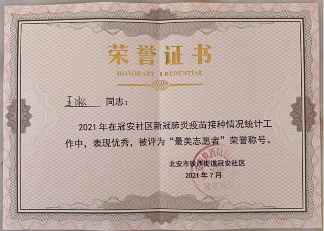 在疫情防控大局中,社区作为疫情防控的一线,是外防输入、内防扩散最有效的阵地。7月15日到8月5日期间,198班王淞协助冠安社区进行人口普查大数据补录、新冠疫苗注射情况登记以及疫苗注射社区宣传等活动,他以行动和担当赢得了居民们的赞誉,被当地社区评为“最美志愿者”。