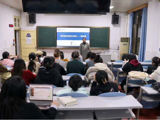 交流会上,副院长曾谷清结合自身经验,为同学们讲解了考研志愿填报与复试技巧。她强调,找好自己的定位是考研上岸的关键,鼓励同学们要充分了解自己的优势和兴趣,合理规划考研方向。