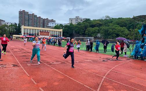 赛前,廖力院长积极热身准备,做拉伸运动,为这场比赛蓄积力量。她状态极佳,对比赛充满自信。小雨淅淅沥沥地下着,雨水打湿了她的衣衫,廖力老师丝毫不减脚下的步伐,率先冲过终点,赢得了现场阵阵喝彩声。