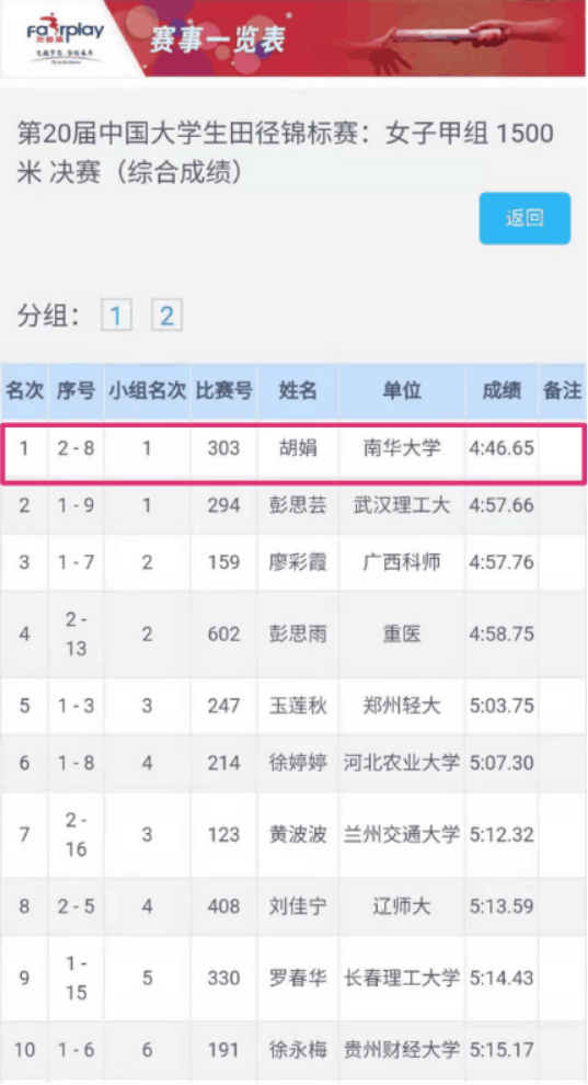 恰同学少年,风华正茂。胡娟曾多次代表学校参加各类大学生体育竞赛,并且都取得了优异的成绩。本次中国大学生田径锦标赛之行,胡娟勇夺女子甲组800米、1500米径赛金牌,两项成绩均成功打破伟德victor1946学生田径最高纪录(女子)。另外,她与伟德国际victor19462020级本科生陈绮婷等协同作战,荣获4*400混合接力赛银牌。