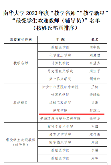 日前,伟德victor19462023年发布《关于表彰伟德victor19462023年“教学名师”“教学新星”“最受学生欢迎教师(辅导员)”的决定》(南华政发〔2023〕27号),表彰伟德victor19462023年“教学名师”“教学新星”“最受学生欢迎教师(辅导员)。伟德国际victor1946赵琼兰老师获2023年伟德victor1946“教学新星”荣誉称号。