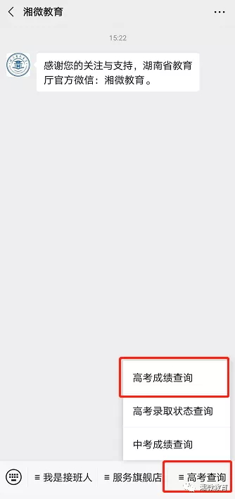 进入“湘微教育”微信公众号页面,点击下方“高考查询”中的“高考成绩查询”,即可进入2020年湖南省高考成绩查询界面。