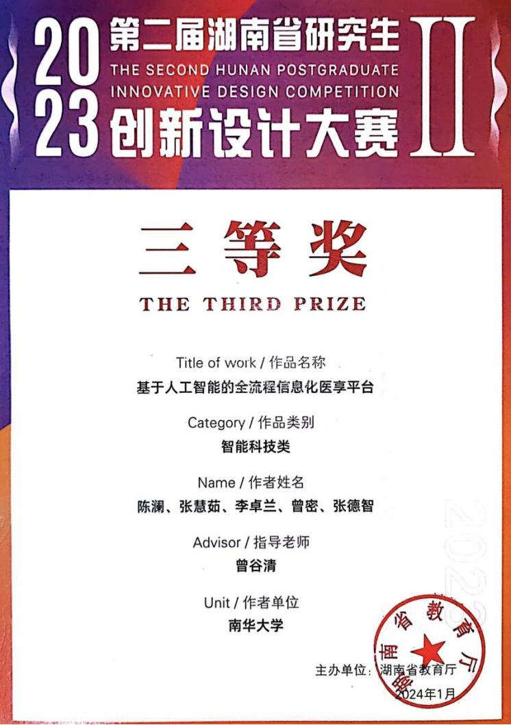 此次大赛中,由我院曾谷清教授指导,2023级研究生陈澜主创的项目《基于人工智能的全流程信息化医享平台》经过校级竞赛、省级复评、省级终评等多个环节的评审,荣获智能科技类三等奖。