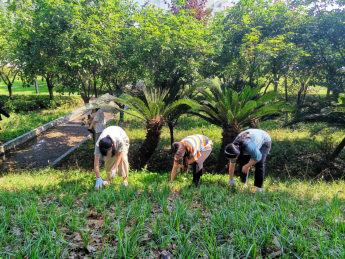 同学们确定好分工后,便带好手套认真拔除斜坡上的杂草,不一会人行道上就摆满了一摞摞杂草垛,吸引了很多行人驻足。同学们的鞋子被黄色的泥土沾满,雪白的手套上也沾满了污渍。下过雨后的草地还有些湿滑,几个同学在拔草时,不时会打个趔趄,但她们互相搀扶,共同克服困难,在短短一个小时内就将原本杂乱的绿地清理干净。大家对此感到十分满足,在一片欢声笑语中结束了劳动。