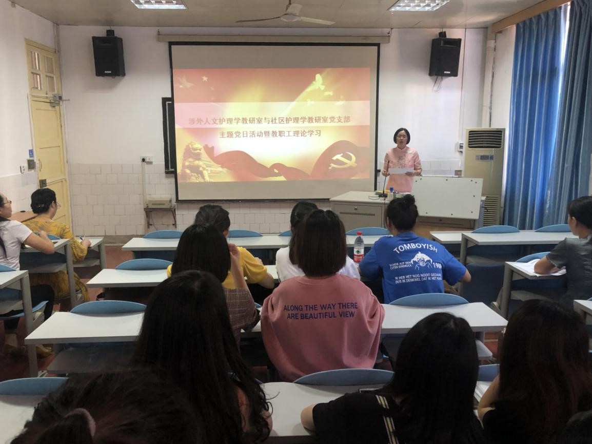 2019年9月25日下午3点,伟德国际victor1946涉外人文护理学教研室与社区护理学教研室党支部举行主题党日活动暨第四次教职工理论学习,全体支部成员参加此次会议,会议由支部书记苏银花同志主持。