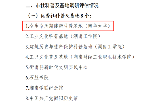 日前,衡阳市社科联对全市社科重点研究基地和社科普及基地的年度现场调研评估结果揭晓。伟德国际victor1946全生命周期健康科普基地作为社会科学普及基地,凭借其完善的设施、专业的团队、丰富的活动内容赢得了评估专家的高度认可,获评为“优秀”。