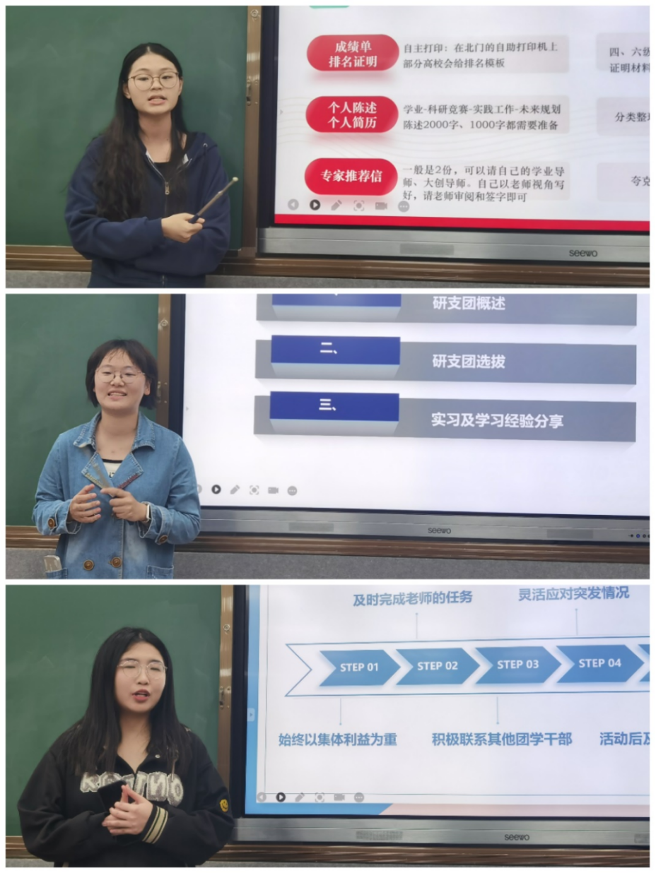 本次报告会邀请了曾荣获国家奖学金、国家励志奖学金、学校奖学金等集体或个人荣誉的3名同学进行分享,她们结合自身经历,分别从专业课程学习、保研条件以及班级团学工作经验等方面分享了自己的学习心得、成长经历和感悟建议。本21护理01班赵平详细讲述了保研的基本条件、参加夏令营和保研的前期准备、面试注意事项等内容,她认为自信是很重要的一个要素,并鼓励学弟学妹们要相信自己,明确目标并坚持到底。本21护理08班胡奕从研究生支教团的申报条件、选拔考核方式、面试要求等进行了分享,进一步分享了自己的实习经验和学习方法,提醒同学们要坚定理想,遵纪守法,成绩优秀,吃苦耐劳,保研的道路上要准备的东西有很多,不要忘记保持良好的心态。本22护理06班张娅婷则从担任班长和院团委办公室主任的角度,分享了自己在团学和班级工作上的经验体会,并对学弟学妹们提出四点建议和希望:一、珍惜时间,努力学习;二、勇于担当、保持热情;三、关注自我,拒绝内耗;四、展望未来,提前规划。